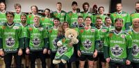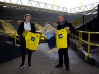 Überwältigt von der stolzen Summe, die am Ende für die Deutschen Kinderhospiz Dienste zu Buche schlug: Nena S., Dominik Kytzia, Michelle Reinecke und Joël Pakulat, die Michael Cremann und Thomas Ballhoff von den Deutschen Kinderhospiz Diensten und Bärenbotschafter Hope am Standort in Dortmund gemeinsam den symbolischen Spendenscheck überreichten.