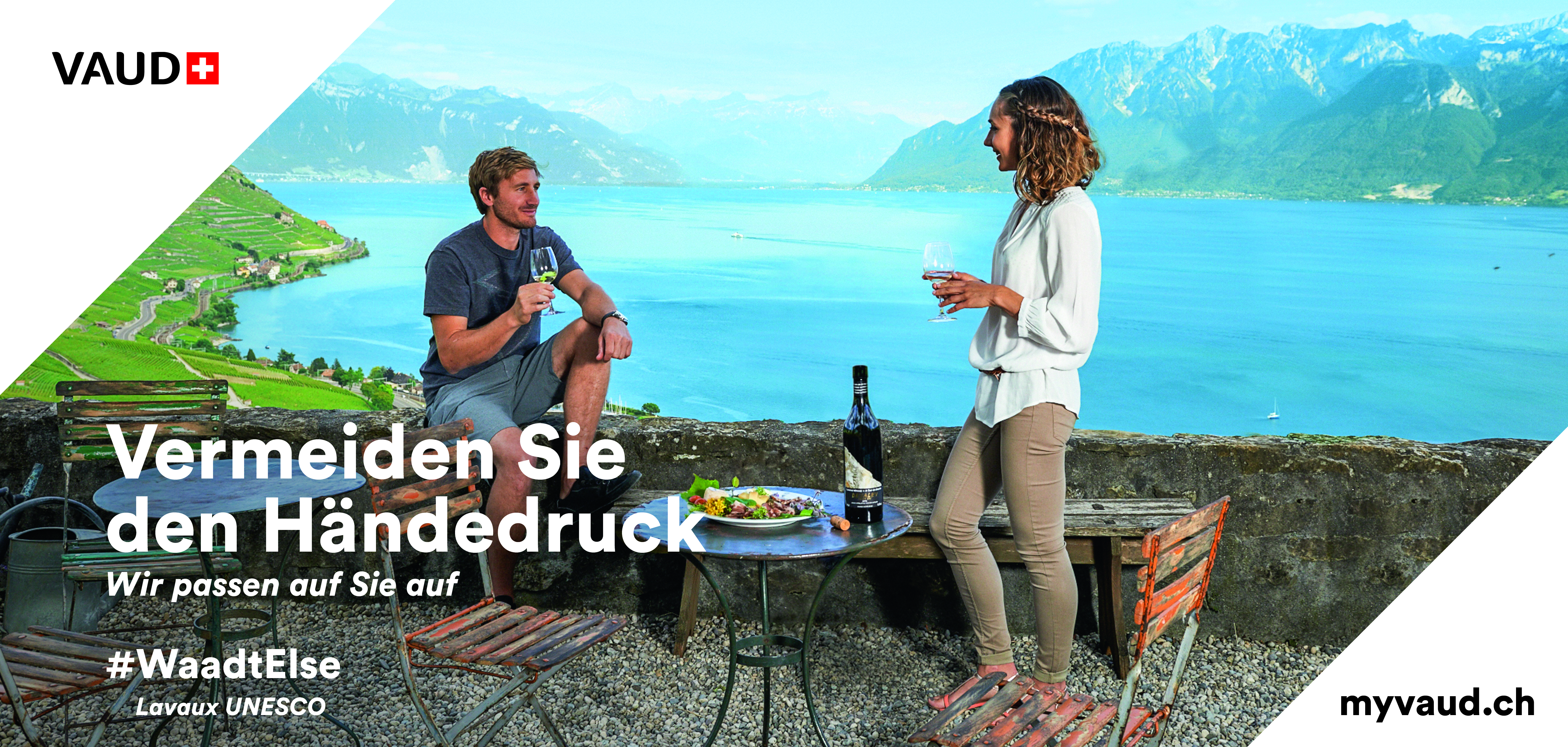 Die Botschaft der Kampagne „Wir passen auf Sie auf“ markiert einen Bruch mit den vergangenen Wochen. Potenzielle Reisende werden auf herzliche, humoristische Art für Ferien am Genferseegebiet eingestimmt. Sicherheitsvorschriften werden nicht mehr als Einschränkungen, sondern als Chance für Spaß und erholsame Ferien im Kanton Waadt interpretiert. So kann man auf dem Fahrrad durch das Lavaux garantiert den „Sicherheitsabstand wahren“ oder in den zahlreichen Seen „sich gründlich die Hände waschen“ sowie beim Zuprosten mit einem Glas Chasselas im Weinberg „Händeschütteln vermeiden“.