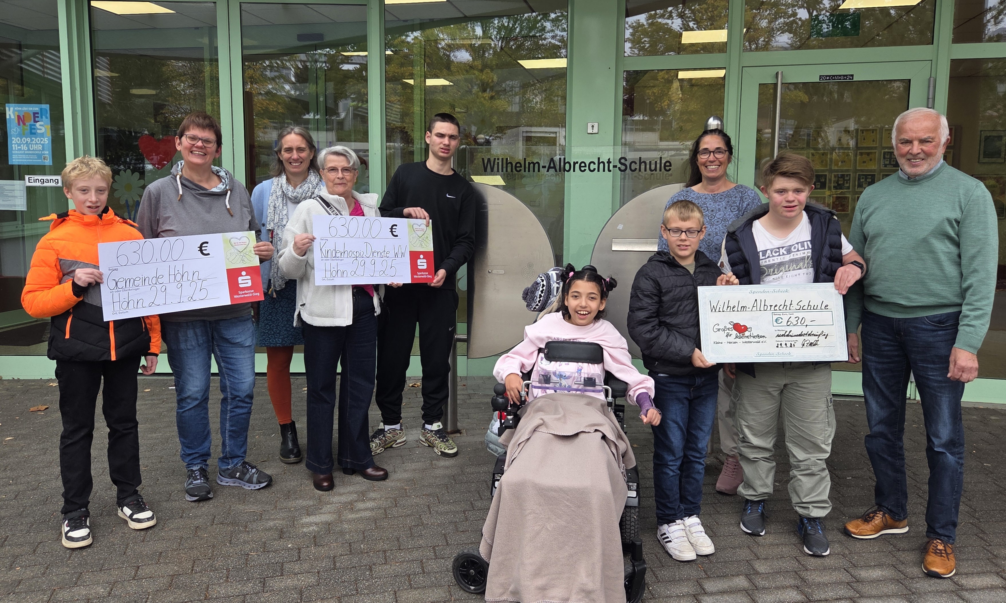 Bild rechts: v.l.n.r. Karin Mohr (Ortsgemeinde Höhn), Josepha Schürg (Konrektorin), Cornelia Cziesla (EA DKD), Marisa Zarella (Lehrerin Wilhelm-Albrecht-Schule), Günter Mies (Kleine Herzen e.V.), Kinder: Malak Daibi, Tylor Friesen, Yannic Schmitz, Kuba Gackowski, Elias Baldus, Josepha Schürg