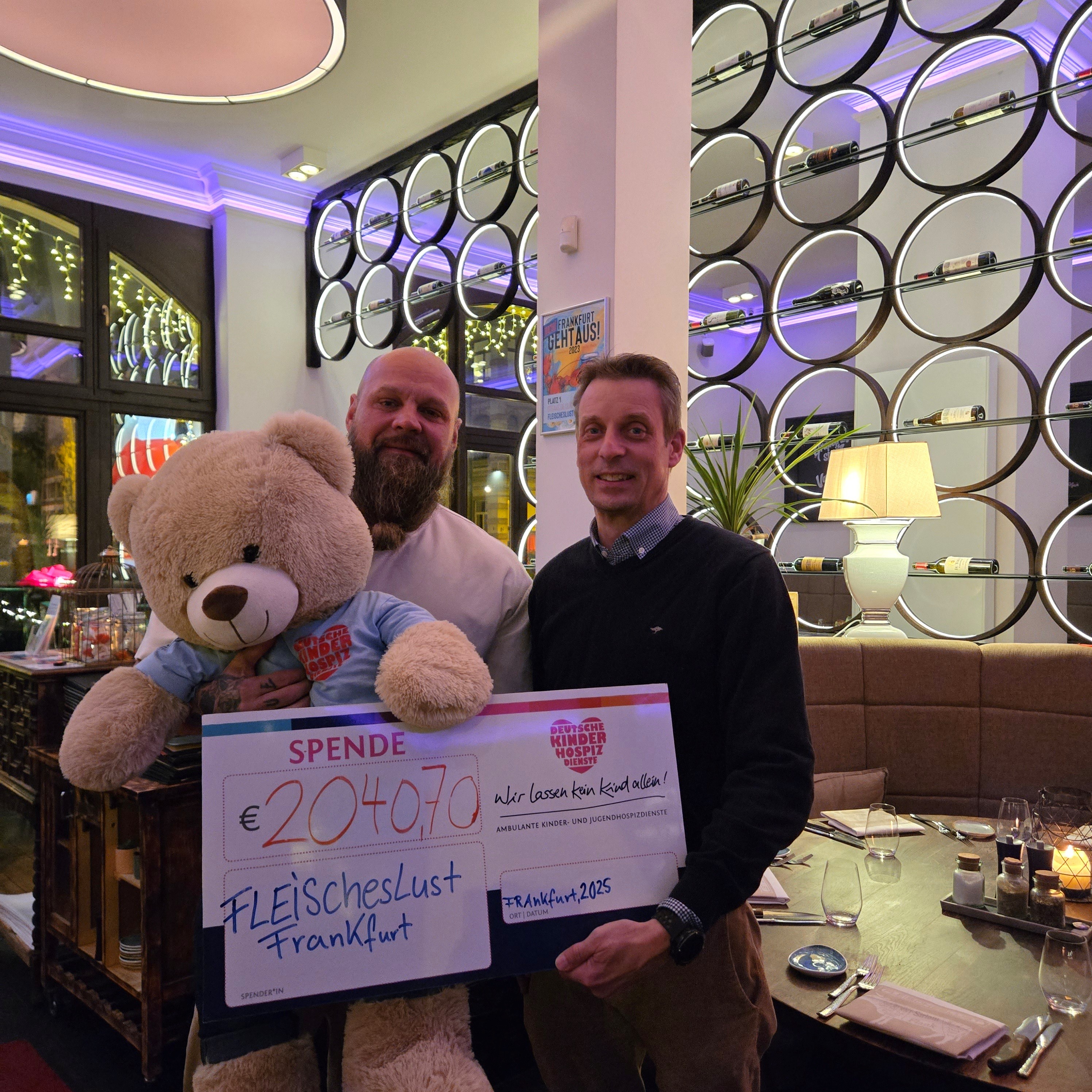 Frankfurt am Main, 08. Dezember 2025 (primo PR): Fleischeslust in Sachsenhausen spendeten mehr als 3.290 Euro, um sowohl das für Frankfurt geplante stationäre Kinderhospiz als auch den dortigen ambulanten Die symbolischen Schecks nahmen Katrin Becker-Oligmüller, Leitung Fundraising Development, und Stephan Engels, Projektleiter des geplanten stationären Kinderhospizes, gemeinsam mit Bärenbotschafter Hope entgegen. Weitere Informationen unter https://deutsche-kinderhospiz-dienste.de/ oder auf https://www.instagram.com/hope.kommt.rum/.