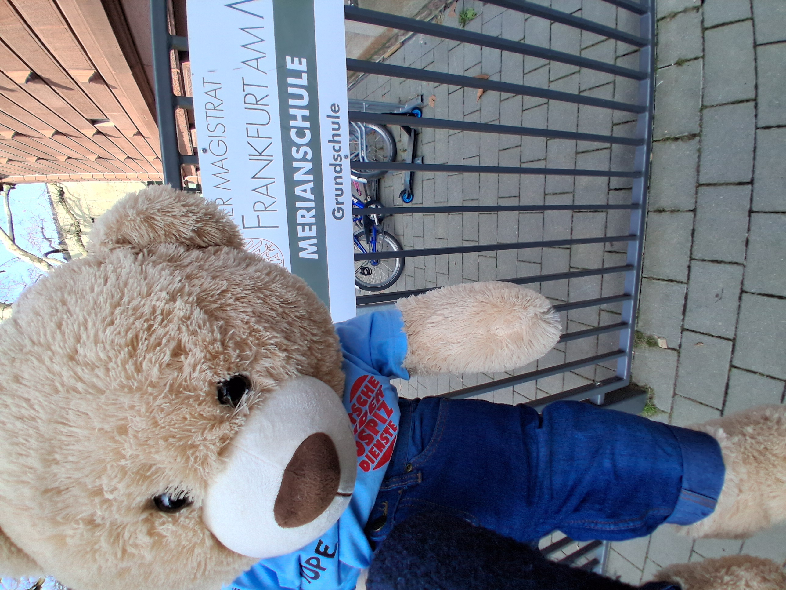 Gruppenfoto mit Bärenbotschafter Hope – Symbolische Spendenübergabe des Erlöses des Kinderbücherflohmarktes durch die Schüler und Lehrerinnen der Merianschule, Renate Iorio (hinten links), Ute Sopha (hinten rechts) an Katrin Becker-Oligmüller, Leitung Fundraising Deutsche Kinderhospiz Dienste (hinten Mitte)