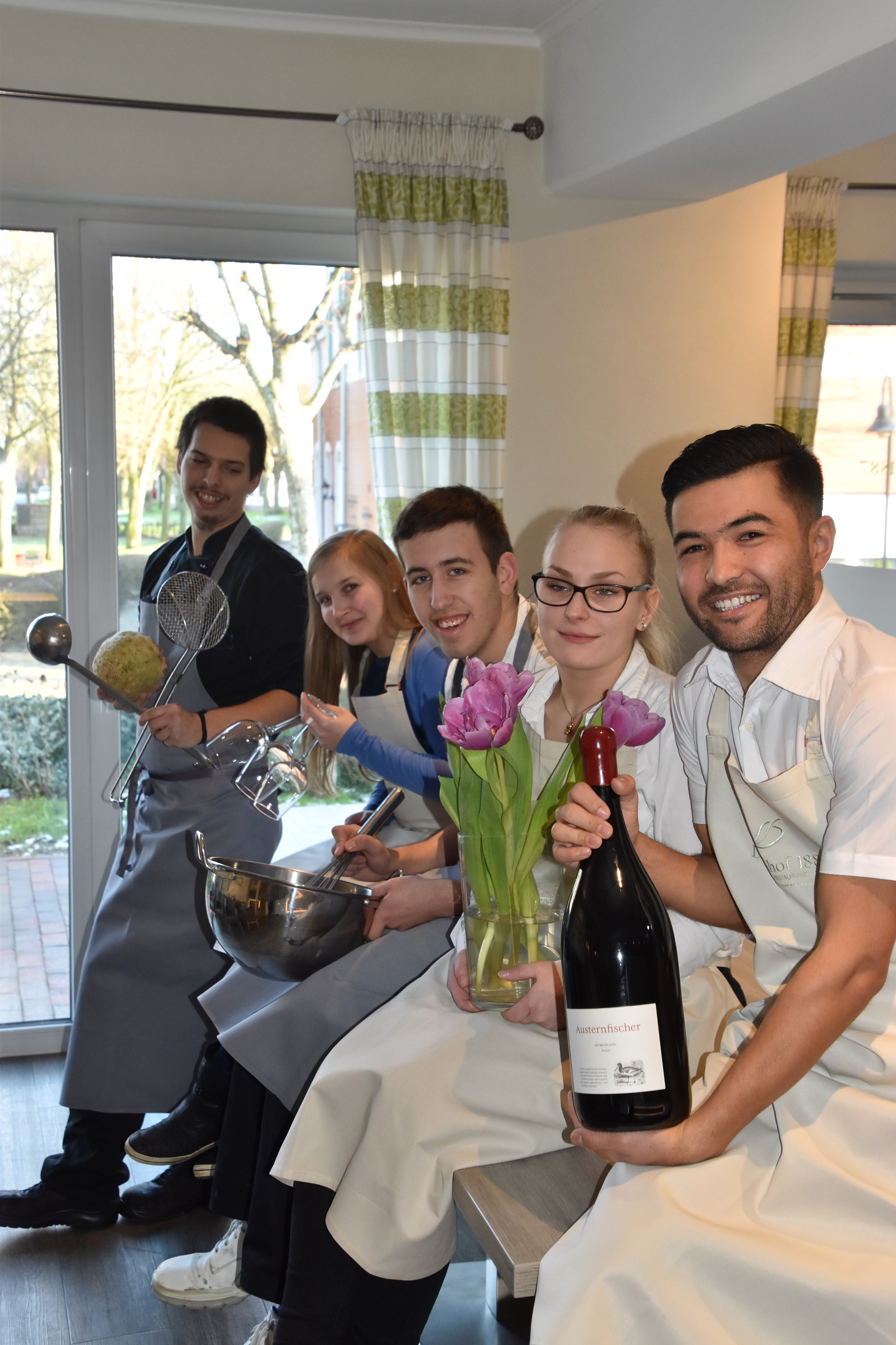 Nichts lieber als das! Nach dem Erfolg im vergangenen Jahr gehört der Azubi-Menü-Abend zu den Höhepunkten des Kulinarischen Kalenders 2019. Am 8. Februar 2019 legen sich die fünf ins Zeug. Während Franziska Schulz, Besmillh Soltani und Anastasia Suchowa mit Können und Charme für schön gedeckte Tische, schnell erledigte Bestellungen und einen perfekten Service sorgen, stellen die zwei Nachwuchs-Köche Jonas Christiansen und Marcel Brunner das Vier-Gänge-Menü zusammen und setzen es gekonnt um. Der Abend startet um 19.00 Uhr mit einem Aperitif. Im Preis von 55 Euro pro Person sind auch Wein und Wasser inklusive. Was auf den Tisch kommt ist noch geheim.